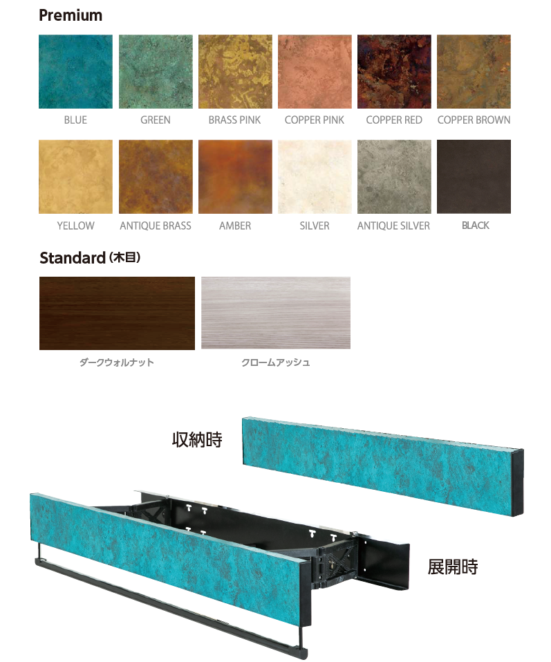 職人の手で薄い銅板を一枚ずつ着色する、伝統技術を活かした「Orii Marble(オリイマーブル)」を取り入れたプレミアムカラーと、空間に馴染みやすい木目柄を取り入れたスタンダードカラー。使わない時は壁面の美しいアクセントに変わり、使う時には実用的な衣類掛けに。